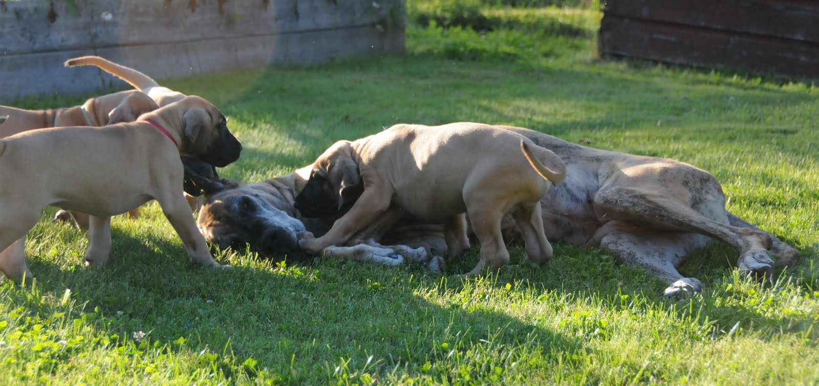 Granny Envy enjoying a good roll in the grass with puppies.